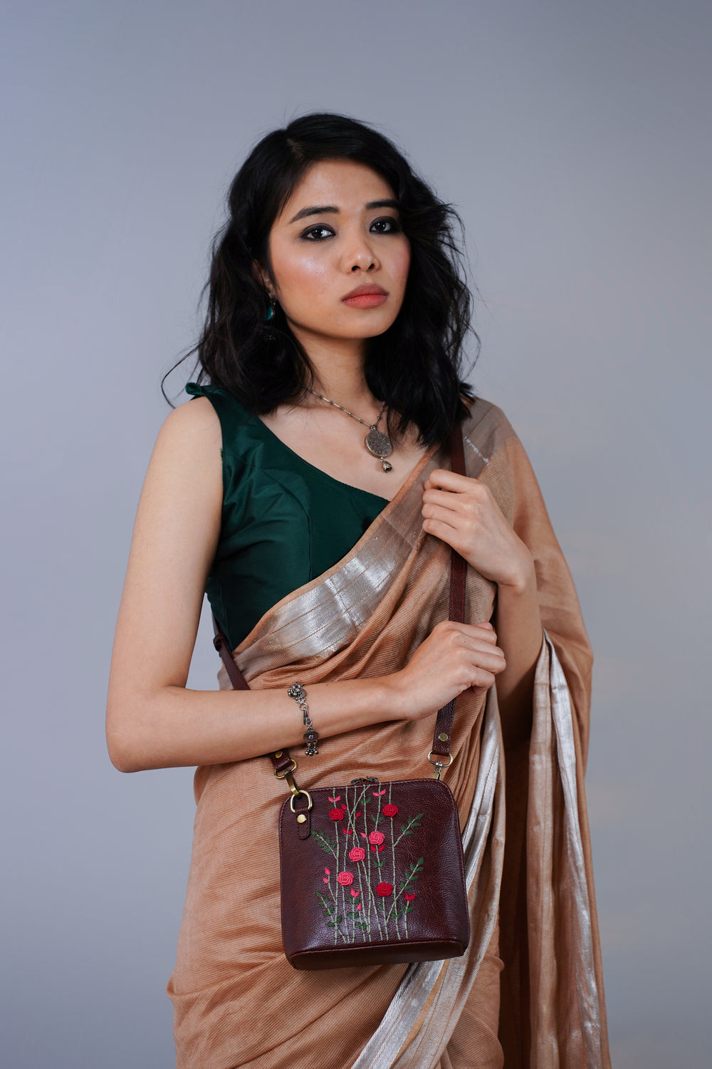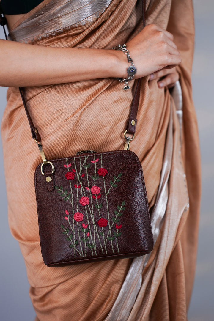 Hand Embroidered Red Rosebuds Venice Sling Bag