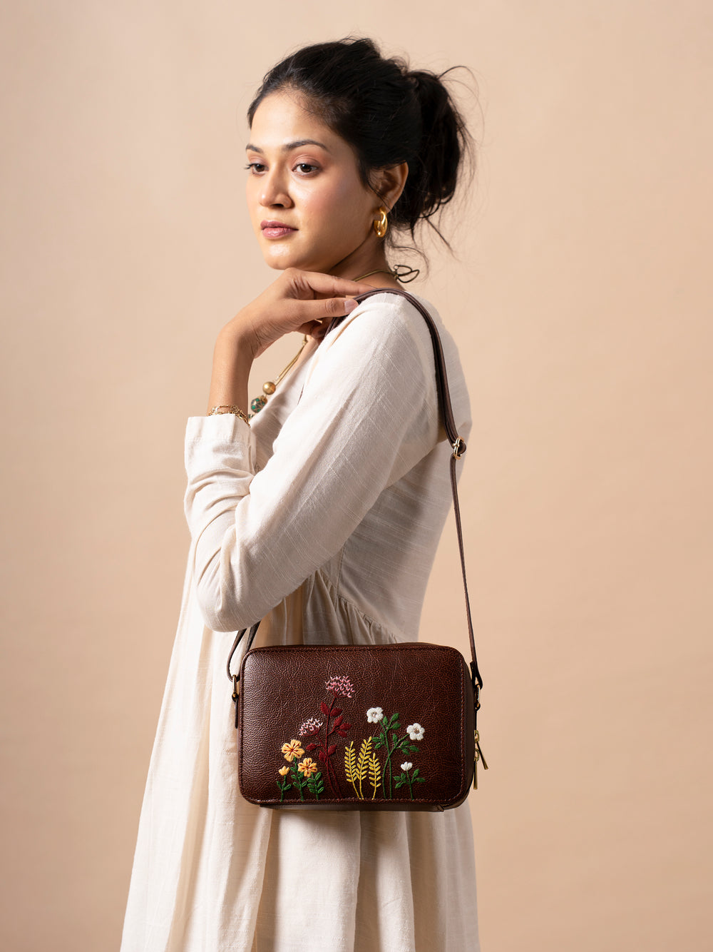 The sling features intricate hand embroidered floral motifs. It is equipped with one main zipper compartment, gold finish accessories and an adjustable shoulder strap. The inside is compartmentalised by two small pockets - one open, one zipped and lined with striped cotton fabric.