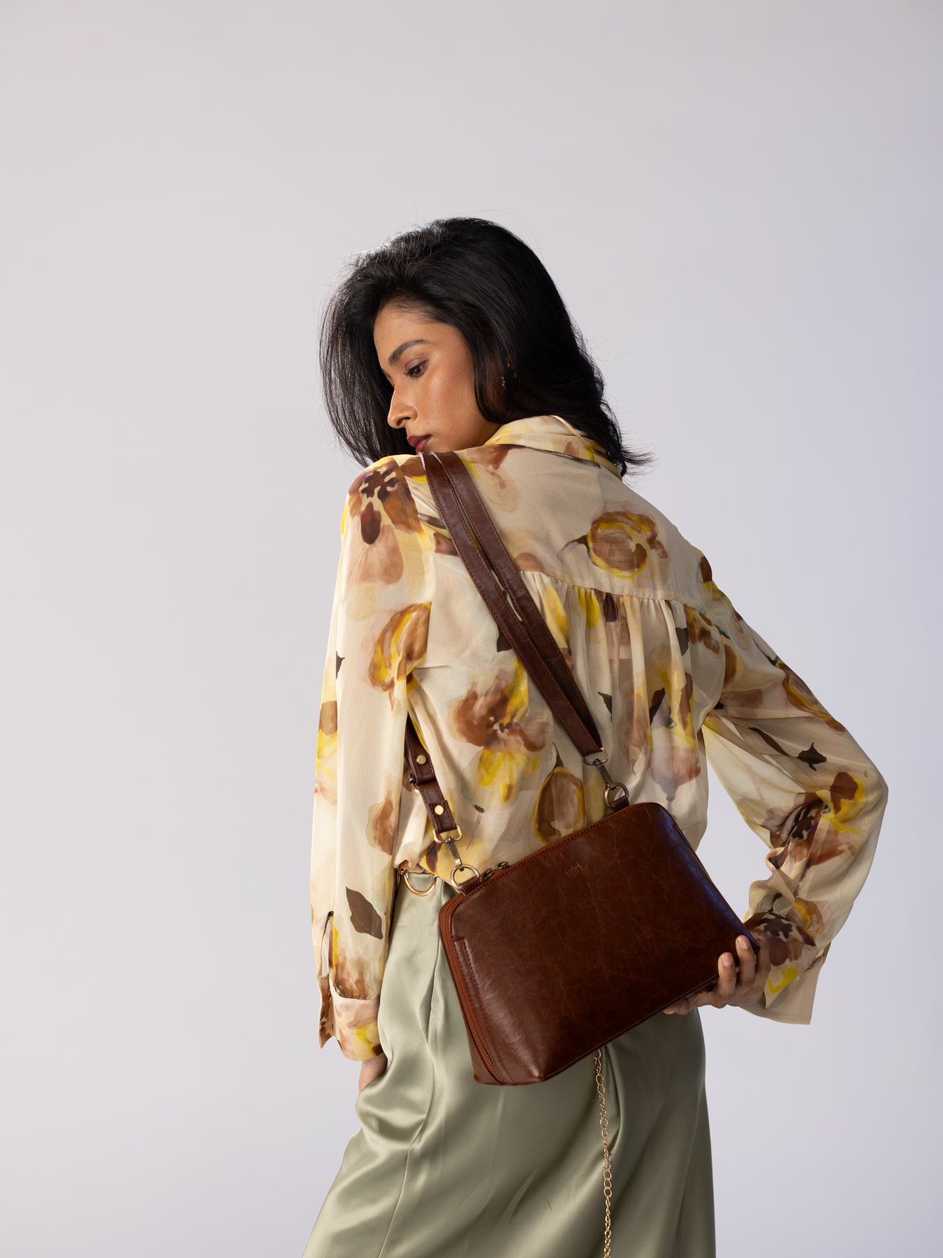 Shaped by the calm, measured geometry of Delhi’s Lodhi district, the Lodhi Sling carries this deep brown with quiet sophistication. Its gently elongated silhouette is spacious without feeling heavy, balanced the way Lodhi’s tree-lined paths and airy courtyards invite you to slow down. Deep Pine Lodhi Sling is a design for the woman who values her roots, but not limited by it.