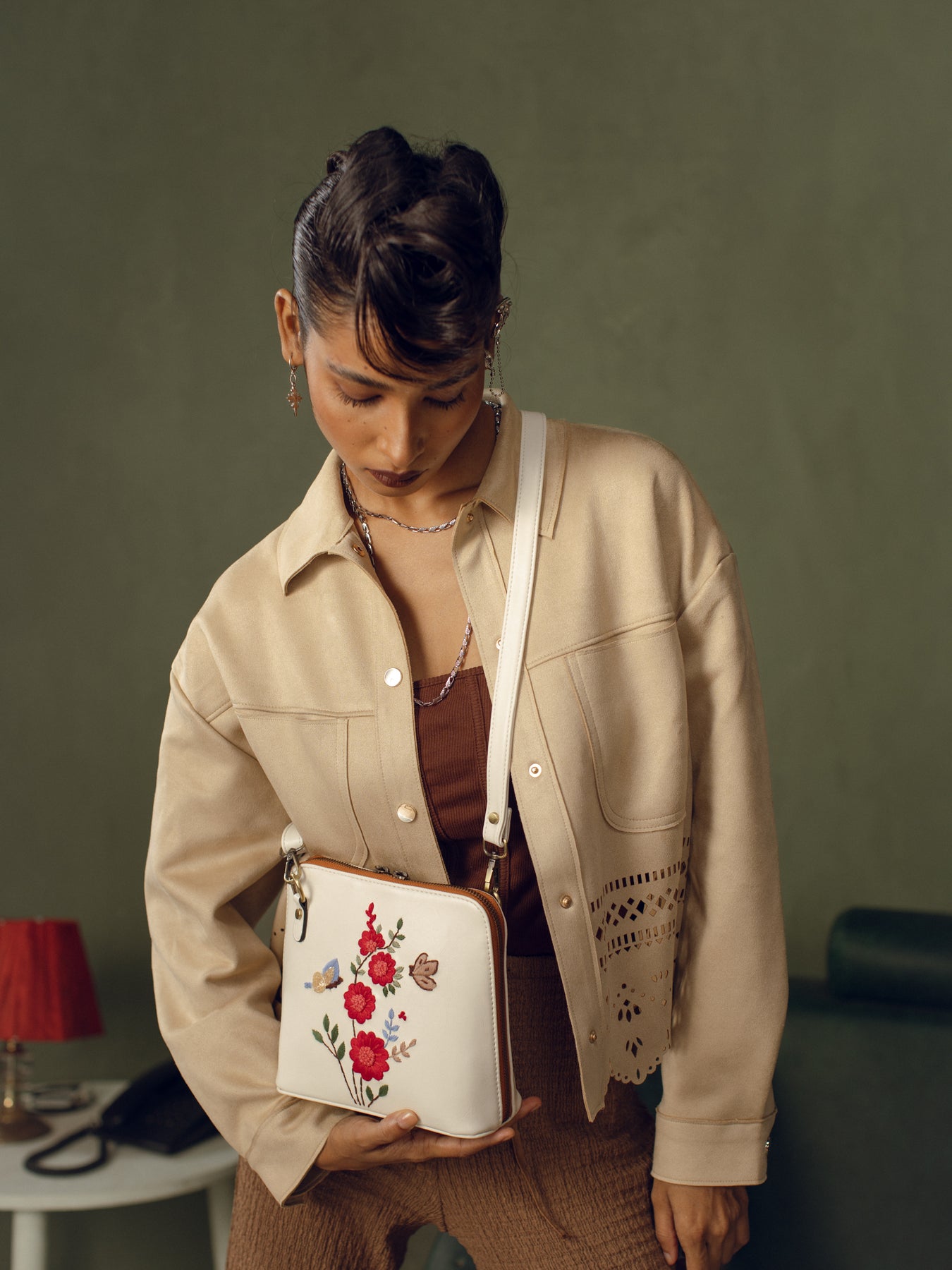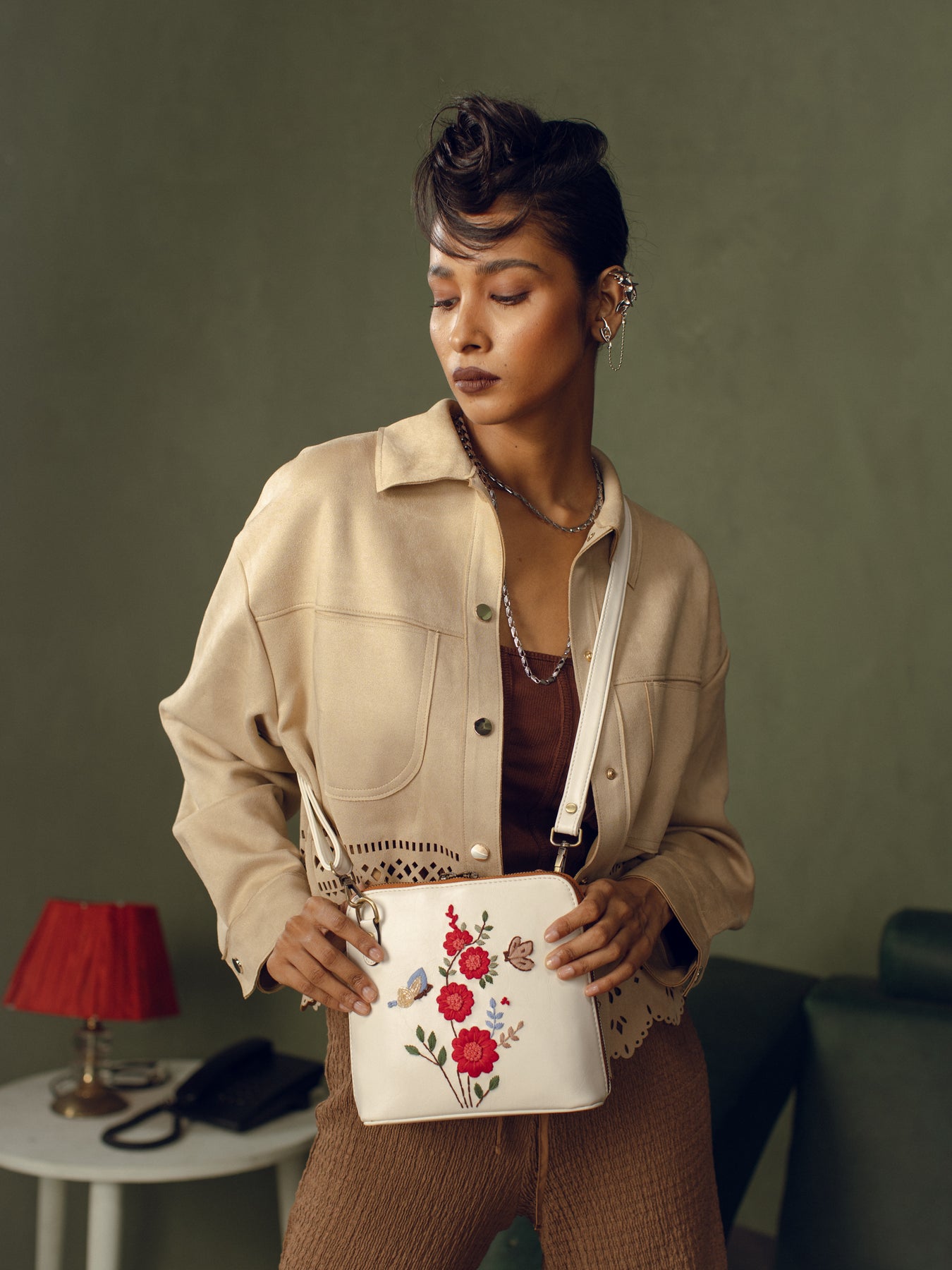 The White Daisy Colaba sling features Miri's all-time-customer-favorite embroidery - The ever so beautiful, white daisy flowers intricately woven into textured leather. Aesthetics of this best seller is such that it can be effortlessly paired, be it with Indian suits/sarees or with western outfits.
