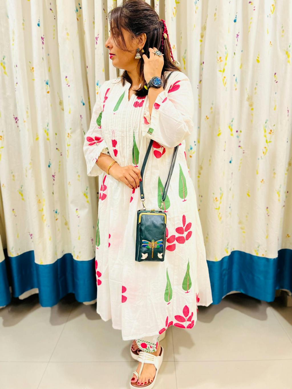 This mobile wallet sling is a canvas of quiet grandeur - featuring a regal peacock brought to life in shimmering zari threads and delicate mukaish work. Every plume, every petal is hand-embroidered with painstaking detail, capturing the grace of India’s most beloved bird in full bloom.