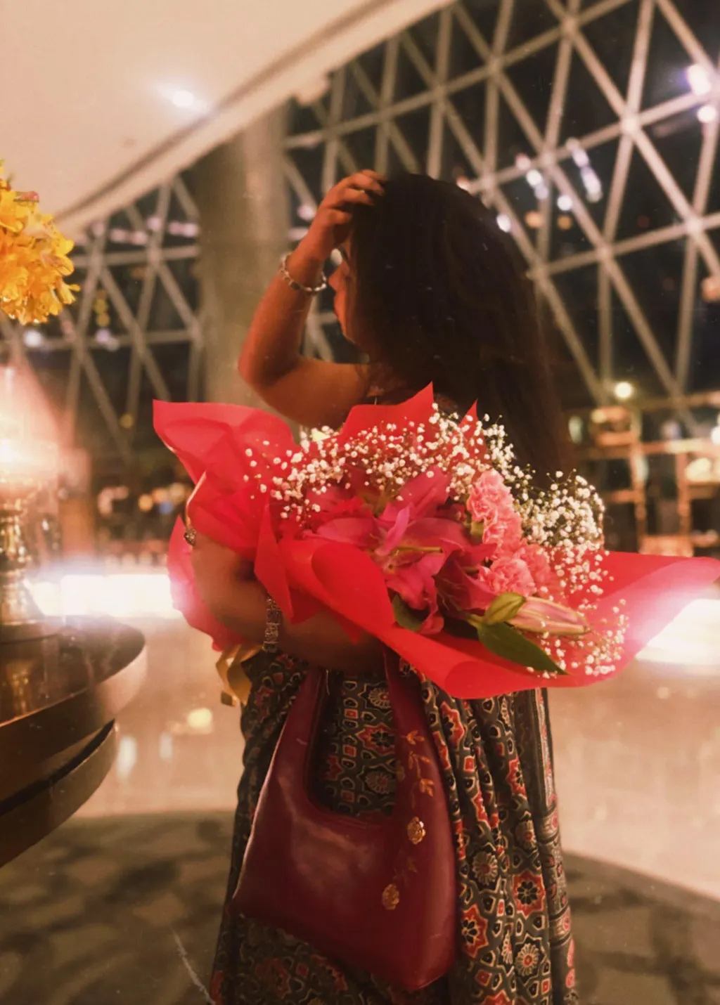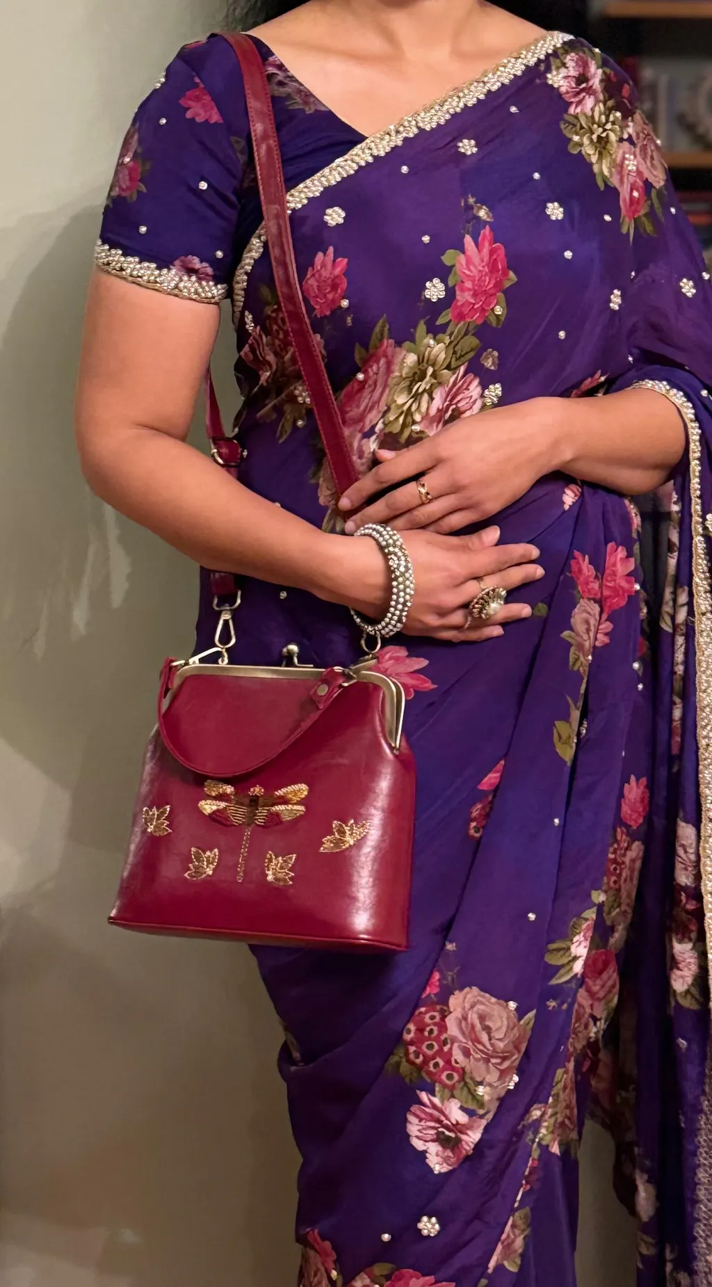 Cloaked in a rich maroon hue, this Gulzar shoulder bag captures the warmth and romance of twilight gardens. Delicate golden roses, hand-embroidered in mukaish artwork and zardozi golden threads, climb gracefully along its sleek crescent silhouette. Designed with modern sophistication in mind, its lightweight crescent shape offers effortless ease while preserving a timeless artisanal charm.