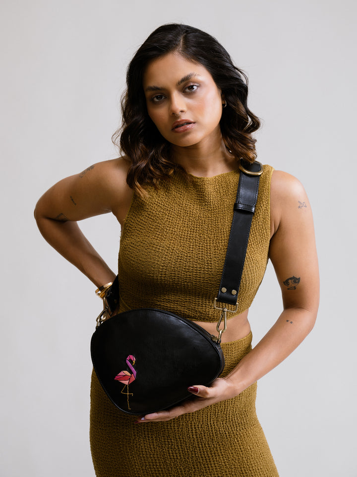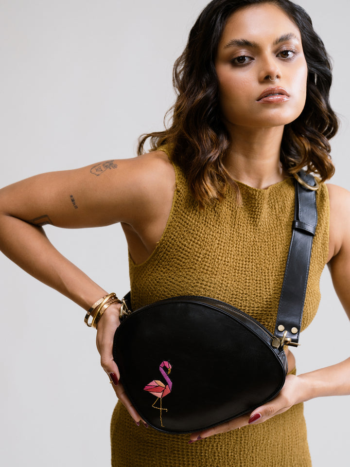 Fashion-forward and striking, this pebble-shaped crossbody sling or fanny pack is perfect for the modern woman who loves making a bold style statement. Crafted from luxurious vegan leather, this bag features a breathtaking hand-embroidered origami bird that brings a touch of artful elegance to your look.