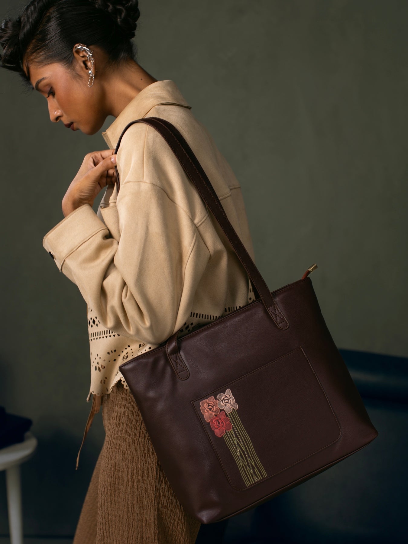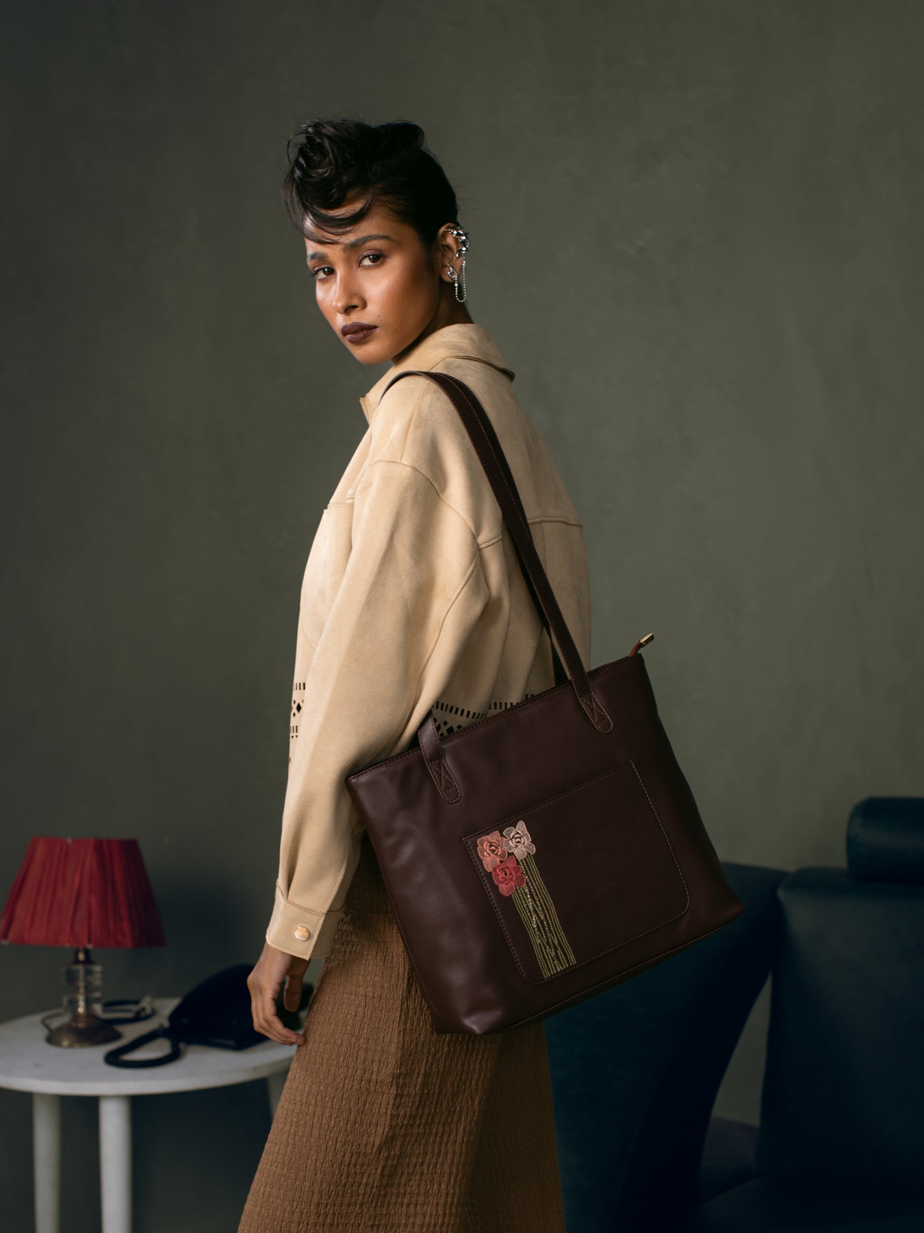 Using our deep cocoa leather as the grounded earth, our embroidery mimics the steady, hypnotic verticality of mountain rain. The long, structured threads represent the 'Baarish' (rain) that washes the forest clean, while the blooms at the crest signify the life that follows. This is not just a pattern; it is the scent of wet earth and the sound of silence, stitched into art you can carry.