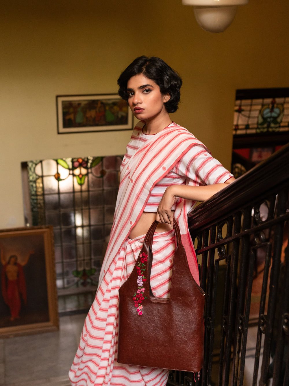 The hand-embroidered brown tote bag features intricate wildflowers in vibrant hues of pink, peach, and red. Extremely lightweight, this bag seamlessly combines style, practicality, and comfort.
