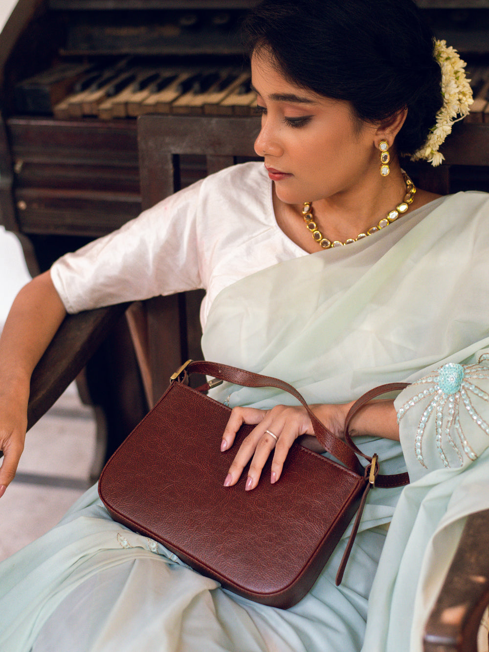 This sleek brown baguette bag strikes the perfect balance between aesthetics and practicality.