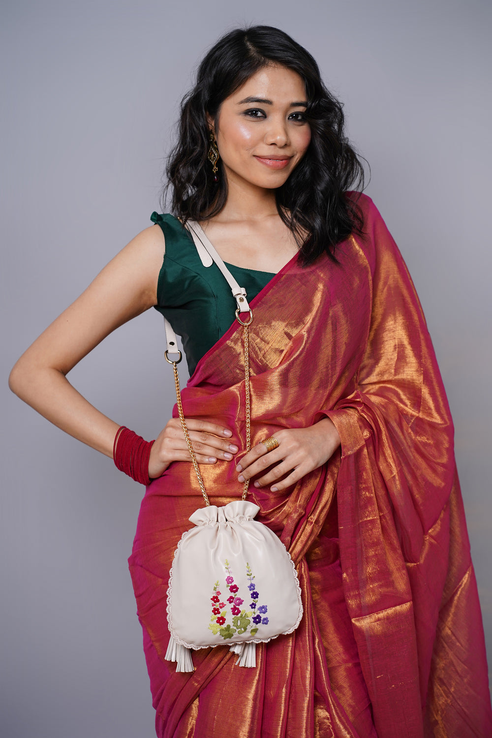 This ivory white potli sling features hand embroidered wildflowers in vibrant hues of peaches, maroons, pinks, and purples; reminiscent of a blooming garden.