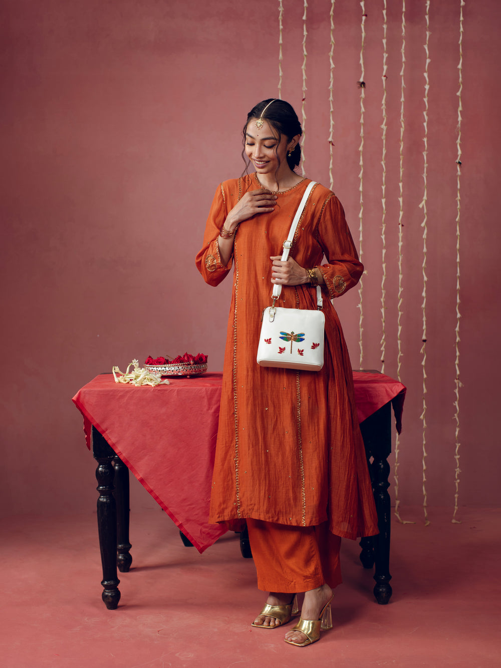 This sling showcases a life-size dragonfly, meticulously hand-embroidered with a fusion of diverse techniques. The dragonfly's wings shimmer with metallic threadwork, Zardozi, beads and sequins. The body is embellished with copper Mukaish artwork.
