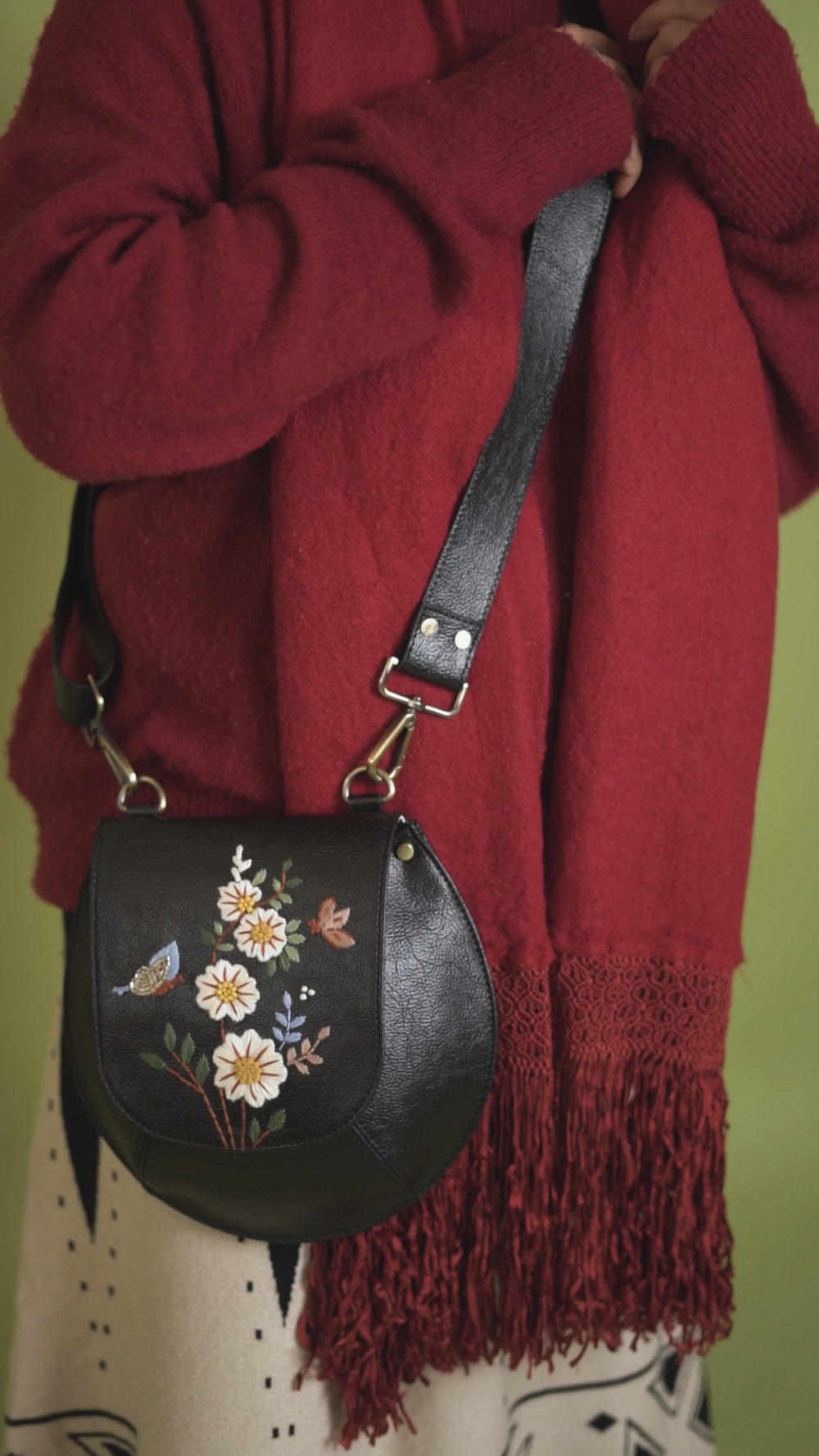 This innovatively shaped sling is functionally spacious but structurally super sleek. The flap of the sling features intricately hand embroidered white daisies, using cotton threads and glass beads. The inside is lined with striped cotton fabric and has an inbuilt card holder. The bag is equipped with antique gold finish accessories and an adjustable, detachable strap. You have the option to choose your preferred strap variant—either thick or thin.
